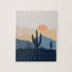 Mexican desert at sunrise illustration with sun, mountains and cactus decoration in navy blue, orange, blue and beige colours on pastel grey background