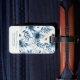 On a light blue background, there is a lovely pattern of dark blue and beige flowers with gold berries.