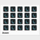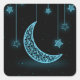 This design features a crescent moon filled with stars of various shapes and sizes outlined in light blue on a black background.