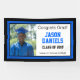 Hang this Blue and Black Grad Photo Banner to celebrate your high school or college graduate. Personalise with your graduate's photograph, full name, class year, and school. It features a black and blue border surrounding your grad's picture, their name in blue and 'Congrats Grad!', class year, and school in black.