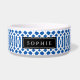 Cute customised cat or dog food bowl with a blue trellis pattern and rectangle frame placeholder for your beloved pet's name.
