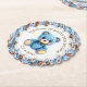 Blue and brown yarn crocheted teddy bear. it's a boy baby shower paper coasters. Adorable trendy theme for a sweet boy's baby shower.