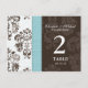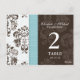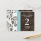 Customise this pretty blue and brown lightly distressed vintage antique damask wedding table number card with a dark brown damask background and blue ribbon contrast stitch design. Personalise it with the bride and groom's name, last name and wedding date on the back and front of the table card. Design © Chrissy H. Studios, LLC. All Rights Reserved.