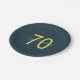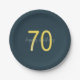 Blue and gold 70th birthday paper plate with the words happy birthday in script across the number 70. This happy 70th birthday paper plate would make an elegant touch to his 70th birthday party celebration.