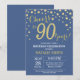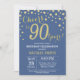 90th Birthday Invitation with Blue and Gold Glitter Diamond Background. Gold Confetti. Adult Birthday. Male Men or Women Birthday. For further customisation, please click the "Customise it" button and use our design tool to modify this template.