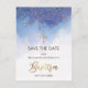 Elegant Baptism Save The Date Postcard. Design featuring watercolor blue background and gold elements on the front with gold cross and Baptism in gold foil script. Add more details on the back of the postcard. To edit this template click customise further. (no real foil will be used).