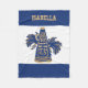 Blue, gold and white cheerleader themed fleece blanket, with graphics of a blue and gold cheerleader's megaphone, and pom poms, in the middle. Personalise the name for your favourite cheerleader.