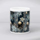 The blue and gold Christmas ornaments and poinsettias all over pattern on this mug is perfect for a cosy night by the fire. Mugs are an easy way to switch out your seasonal home decor. AI assisted graphic purchased with commercial use. Artwork: DreamCafeArt