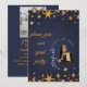 Celebrate your graduate’s big achievement with this elegant blue and gold starry graduation party invitation. Featuring a customizable photo of the graduate framed by shimmering golden stars, this design blends sophistication with festive charm. Personalize the back with event details—name, date, location, and RSVP—to create a keepsake that guests will treasure. Perfect for high school, college, or any milestone graduation, this invitation sets the tone for a night of joy and accomplishment.