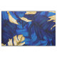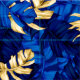 Tropical leaf pattern fabric in accents of blue and gold.