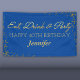 Elegant unisex birthday party banner featuring a blue background that can be changed to any color, with the words "eat, drink and party" in a faux gold foil script and a simple text template.