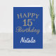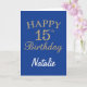 Blue and Gold Glitter 15th Birthday Card with personalized name. For further customization, please click the "Customize it" button and use our design tool to modify this template.