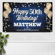 Fun banner sign for indoors or out, featuring festive silver metallic balloons on both sides of the design with sparkly, gold metallic confetti on a rich textured blue background for your personalised birthday banner. This product doubles as a wonderful milestone birthday keepsake.