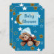 Cute boy baby shower blue and gold moon and stars sleepytime teddy bear in pyjamas invitations.