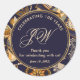 Elegant blue and gold pattern 100th birthday thank you sticker for favours or thank you notes. A traditional abstract blue pattern provides the background. A double gold frame surrounds a navy blue circle which contains the text. A chic script monogram is featured in the centre. Celebrating 100 years is above the monogram. A thank you  statement and birthday is below. All of the text can be edited.