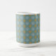 This mug features a tiled pattern in soft blue and gold by artist Jayne Wilson.