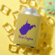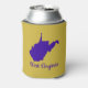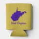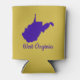 The shape of the state of West Virginia in blue and the name West Virginia in blue text on an old gold background.