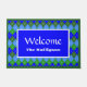 Personalised blue and green argyle welcome mat. Argyle is always stylish. Blue and green argyle design, blending a classic preppy diamond pattern with lively shades of blue and green. Personalised gift for your mum, dad, sister, brother, cousin, uncle, aunt, grandpa, nana, golf buddy, office mate, new homeowners, or newlyweds.