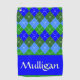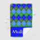 Personalised blue and green argyle golf towel. Eclectic Grandpa and Jazz Revival are looks both trending in 2024 and argyle fits perfectly into that stylish trend. Blue and green argyle design, blending a classic preppy diamond pattern with lively shades of blue and green. Personalised gift for your mum, dad, sister, brother, cousin, uncle, aunt, grandpa, nana, golf buddy, office mate.