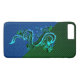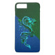 Colourful fantasy themed iPhone 7 Plus case done in a green on green gradient pattern, on the upper part of the case and a gradient blue pattern, on the lower part. Graphics artwork of a blue and green Chinese style dragon, decorates the middle of the case. Customise to add any text you want to this unique case.