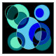 Colorful and geometric abstract pattern, various shades of green and blue intersecting circles on black background