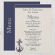 Nautical themed wedding menus done in ivory, with navy blue accents and vintage artwork of a ship's anchor, on the left side. Personalise the blue text for your wedding celebration. Matching products are available.