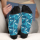 Whether you're fishing for trout or fishing for compliments you'll look great in these socks. They feature simple illustrations of trout fish in ivory, teal blue and navy blue set against a cool blue background.