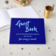 This simple guestbook features the messages "Guest Book" and "Your message is desired!", along with a custom event/occasion date and description. The text is coloured light sky blue, and the background is coloured blue. A generic, customisable guestbook like this could perhaps be used at an event such as a wedding, a family reunion, a retirement party, a baby shower, or some other event.