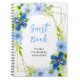 This fun and whimsical birthday party guest book features watercolor baby blue and navy blue flowers with foliage on a gold geometric frame. The text combines handwritten script and serif fonts for a stylish and modern look. This is perfect for a spring or summer rustic birthday party.