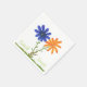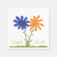 Painting of a blue and an orange daisy flower, coming from the same centre, is printed on personalised wedding napkins.