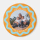 Personalize this circle magnet with your photo and descriptive text to create one of a kind magnet gifts for friends, parents and grandparents. The wavy line bottle cap style squiggle is chic and trendy in aqua blue on a juicy orange background. Create your own custom magnet by using the blue edit design button to change the colors and fonts to suit your style completely.