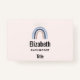Name tag with a cute and whimsical rainbow. Blue and peach watercolors.