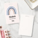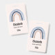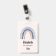 Name tag with a cute and whimsical rainbow. Blue and peach watercolors.