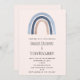 A wedding invitation with a cute and whimsical rainbow. Blue and peach colours.