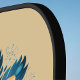 This design features beautiful blue, gold, dark orange, and peach feathers spun into an esoteric mandala, with an interesting infinity-like shape in the middle. The design features retro colours, and the mandala is nestled on a dark ecru background. Your name is written in dark cream text on a dark blue teal backgrond. Make sure to type your name to replace the placeholder name and customise the pickleball paddle design.