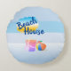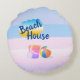 Customized round cushion in Blue Beach House design with sand bucket and beach ball. The design has two themes: the blue pattern (front) and the pink and blue pattern (back).