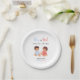 These playful paper plates feature a sweet baby boy in blue and baby girl in pink, both with pacifiers and adorable outfits. The girl wears a pink bow while the boy is dressed in a matching romper. A charming and cheerful addition to your gender reveal table setting.
