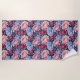 This beach towel features roses and peonies in soft sky blue, delicate shell pink, and dark wine red, with teal and purple foliage in the background. Beautiful and luxurious with a vintage country look that’s still very modern.