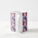 This coffee mug features roses and peonies in soft sky blue, delicate shell pink, and dark wine red, with teal and purple foliage in the background. Beautiful and luxurious with a vintage country look that’s still very modern.
