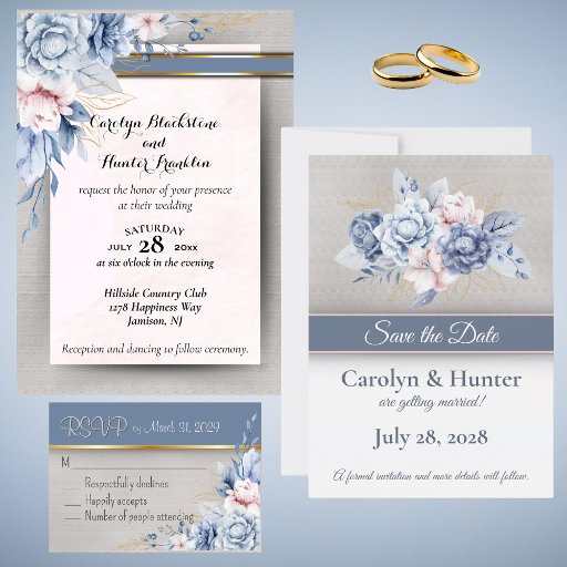 Gorgeous and elegant, this design features beautiful blue and dusty pink flowers on a light pink and grey background accented by a blue, pink and gold metallic ribbon inside. Fully customisable with your own verbiage. See coordinating items in this collection.