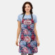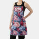 This apron features roses and peonies in soft sky blue, delicate shell pink, and dark wine red, with teal and purple foliage in the background. Personalise with your name in a rectangular badge in complementary pink shades.Beautiful and luxurious with a vintage country look that’s still very modern.