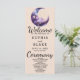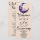 Introducing our Celestial Charm Wedding Program, a captivating and enchanting addition to your celestial-themed wedding celebration. This program boasts a sophisticated pink champagne background, setting the stage for a modern and ethereal design. Against this soft and elegant backdrop, a striking crescent moon in shades of blue and purple takes centre stage, surrounded by wispy clouds that seamlessly blend into the celestial expanse. Accentuating the moon and clouds are an array of white, yellow, and gold stars, forming a celestial constellation that adds a touch of celestial magic to the overall design.