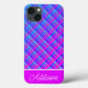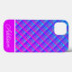 This iPhone case features a blue and purple gradient plaid pattern with a thick purple stripe and thin white stripe with a customisable name.