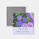 Beautiful blue and purple hydrangeas with dark green foliage accent this elegant save the date magnet. The border colour is a soft shade of blue. Customise as desired.