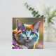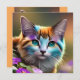blue and rust calico cat and flowers