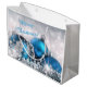 Elegant Christmas gift bag with beautiful blue glittery Christmas ornaments, white sparkling lights, shiny silver pearls and tinsel.