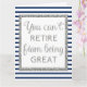 A blue and silver retirement card. The front says you can't retirement from being great, which is trimmed with a beautiful silver glitter design in front of a blue and white striped background. The inside reads a retirement sentiment, but you can easily personalize. The back says happy retirement in silver glitter against a blue and white striped design. This would make a unique keepsake for the retiree.