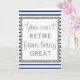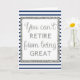 A blue and silver retirement card. The front says you can't retirement from being great, which is trimmed with a beautiful silver glitter design in front of a blue and white striped background. The inside reads a retirement sentiment, but you can easily personalise. The back says happy retirement in silver glitter against a blue and white striped design. This would make a great keepsake for the retiree.
