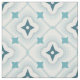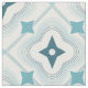This fabric features a repeating pattern of various shapes in shades of blue and teal.