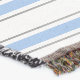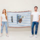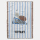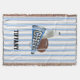 Cheerleader's fringed throw blanket done in a blue, light grey, and white striped pattern. Graphics of a football and two megaphones, decorate the middle of the blanket. Personalise the bold black text to suit your needs. Great for keeping warm, on the bleachers, and as a throw for your bed.
